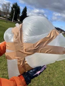 公園では大きなポリ袋に空気を入れて、ジャンボ風船リレーをしています🎈