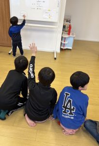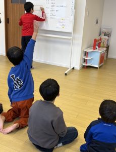 お題は「キャラクター」や「乗り物🚒🚅」「果物🍎🍌」などいろいろやってみました!描く子の「表現力」、答える子の「想像力」が問われますが…お友だちが描いてる絵を見て「え、なんだろう?」「あっ!分かったー」と手を挙げていました🙋🏻♂️