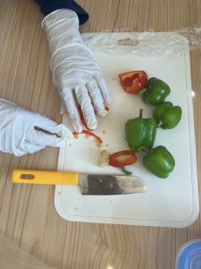 小さなお子さんはキッチンバサミでウインナーを切ったり、高学年は包丁の使い方も慣れたものでスライス玉ねぎを薄〜く切るなど、それぞれのお仕事をします。小さくて可愛いサイズのパプリカを見て「ピーマン嫌いだけどちょっと食べてみようかな?」なんていう会話も聞かれました。