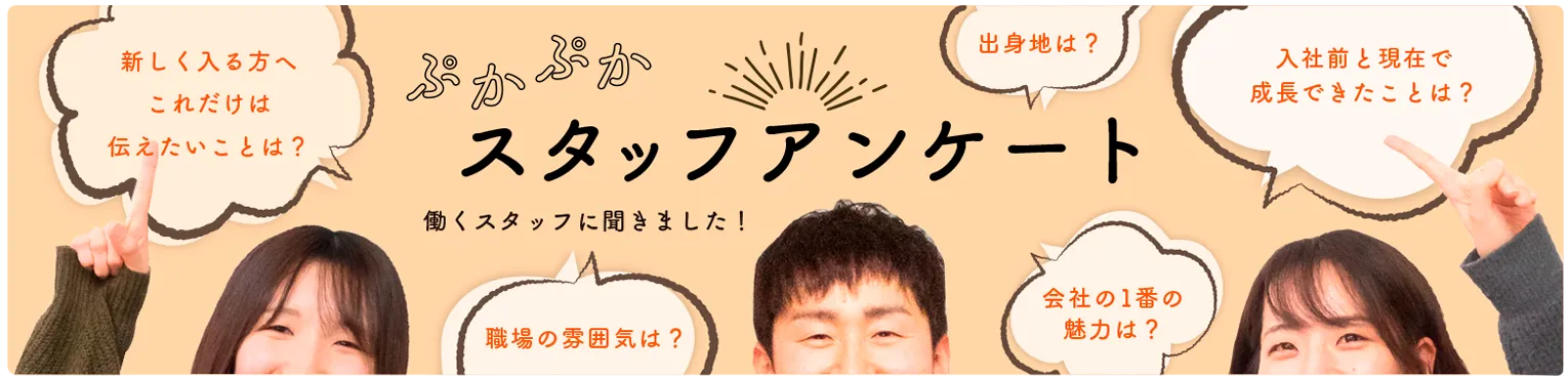効率化や残業、健康診断、研修制度、産休・育児休暇など、ぷかぷかで働くにあたっての制度や環境についてご紹介します。